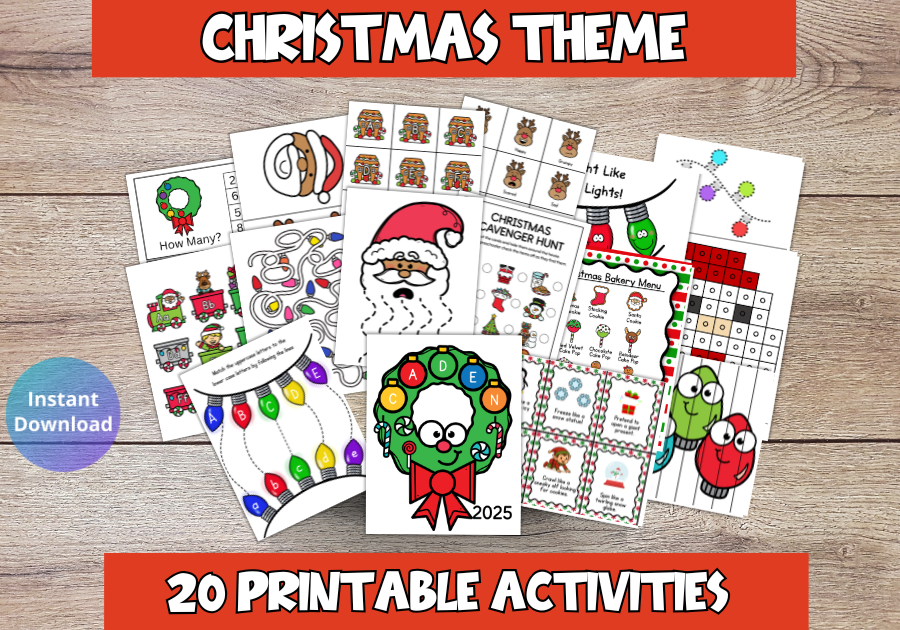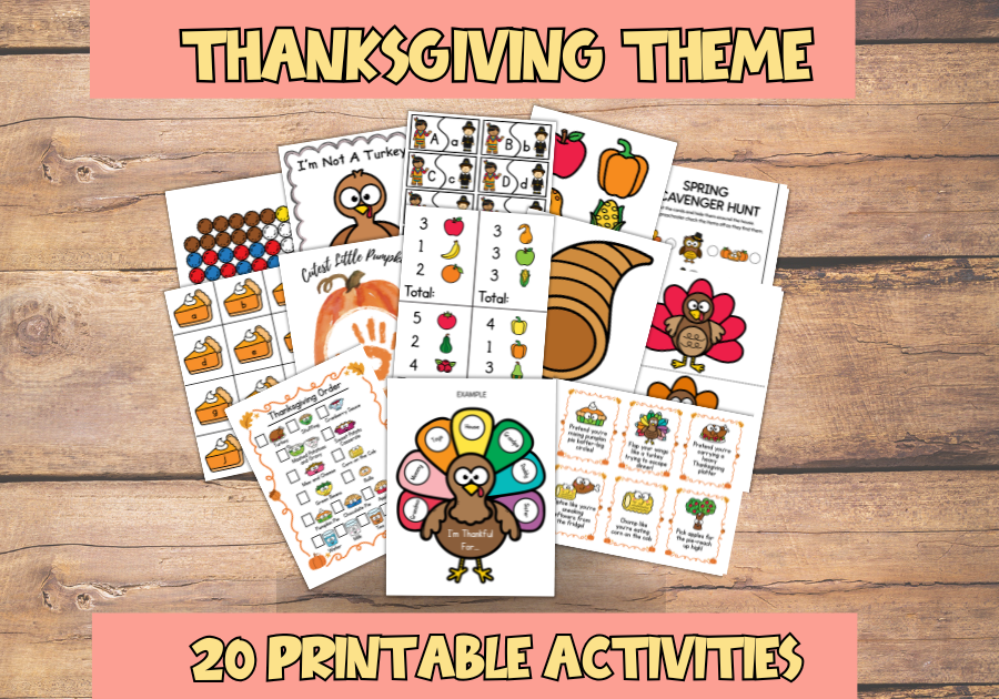 Make Thanksgiving learning fun with this preschool activity bundle! Includes 20 printable activities covering literacy, math, fine motor, crafts, dramatic play, and movement. Perfect for preschool, Pre-K, and homeschool. Easy, low-prep, and kid-approved! Includes weekly snack ideas, book suggestions, and songs.