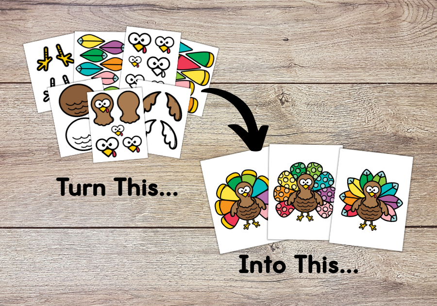 This printable set includes 6 colorful pages and 6 black & white pages with mix-&-match pieces so kids can design their own silly, sweet, or creative turkeys. The possibilities are endless — no two turkeys will ever look the same!